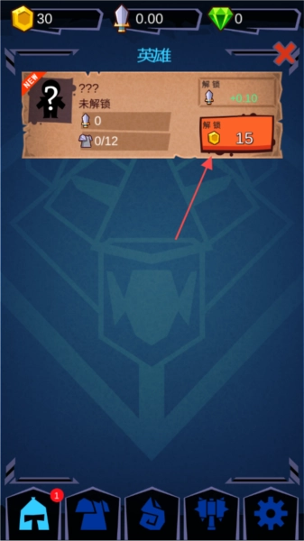 3、进入英雄界面后,若资源充足,点击【解锁】按钮,消耗15金币即可解锁新英雄。