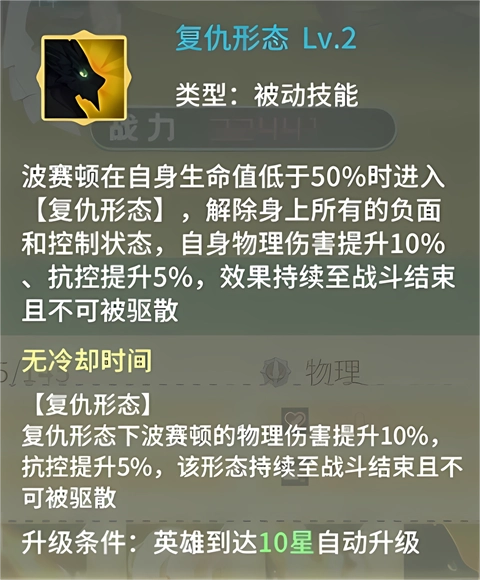 波赛顿在自身生命值低于50%时会进入【复仇形态】,此时将解除身上所有负面与控制状态,同时自身物理伤害提升15%、抗控能力提升10%,该效果会持续到战斗结束且无法被驱散。