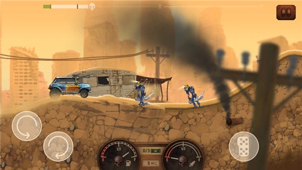 3、当当前车辆无法使用时,可切换至第二辆车,先将其汽油加满,随后持续按住右侧按钮向前行驶撞击僵尸。