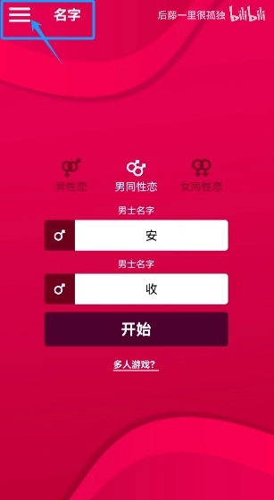 1、首先我们要进入到内选择一种恋爱类型,接着输入两个人的名字,确认无误后点击开始;