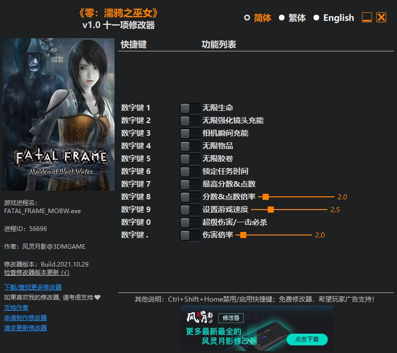 零濡鸦之巫女为用户提供十三项强大的修改功能,涵盖无限生命、无限镜头充能、物品、交卷等,还支持玩家自主编辑分数与速度,以及灵石灯无限制使用等。有需要的朋友欢迎使用。
