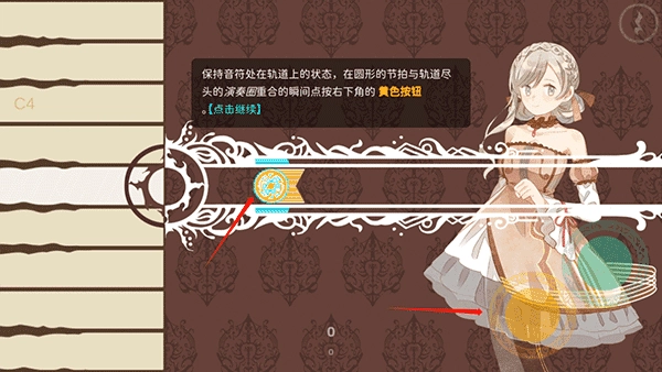 1、在屏幕中上下滑动左侧区域,让画面里的音符落到中间的轨道上。操作成功时,音符会和轨道上的圆形节拍相接触并被点亮。
