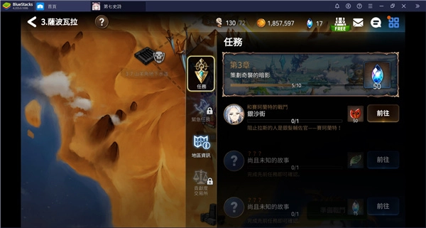 在《第七史诗》中,每个地区对应着故事的一个章节,所以探索地区的过程也是了解对应章节主线故事的过程。在地区地图界面,点击右侧栏的「任务」图标,就能查看当前章节的任务。每个章节包含若干任务,点击任务标签右侧的「前往」图标,就能直接开启该任务。完成每项任务都能领取相应奖励,而当章节的所有任务都完成后,还可以领取章节专属奖励。