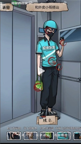 1、根据图片找出保安大叔、神秘小姐和外卖员身上存在的疑点。