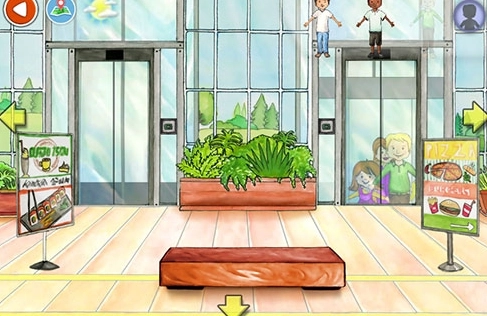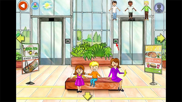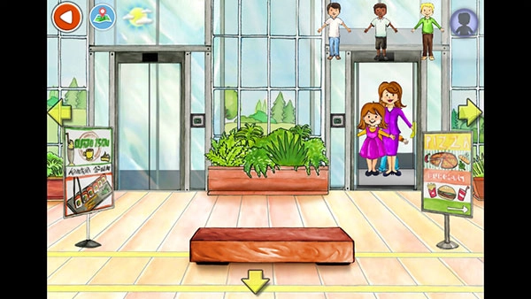 4、切换场景的操作也比较简单,点击左右两侧及下方的箭头按钮就能完成切换。从图片中可以看到下一个场景里有电梯,我们点击电梯按钮,就能打开电梯门。