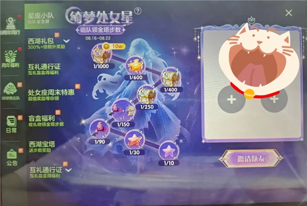 还有这种星座任务,得叫上两个好友一起做,每天花点时间肝一下就能拿到第四档奖励,不过其实主要是冲着二档的三塔牌子去的。