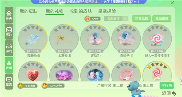 最后的最后呢?就是这些送礼积分,你自己点一下头像,再点击收藏,周五、周六、周天就可以用积分换蘑菇啦。