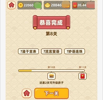 2、关卡模式设计巧妙有趣,采用经典的成语答题操作方式,由一系列任务挑战构成,通过成语答题,既能益智又能增长成语知识,还能逐步解锁难度更高的关卡;