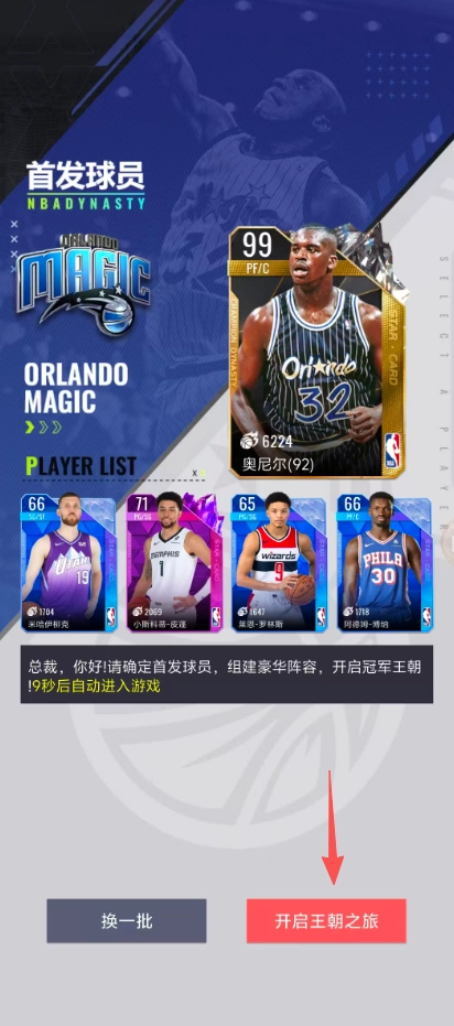 4、接下来就可以挑选自己的NBA首发球员阵容啦,如果觉得不满意,还能点击“换一批”继续选择;选好之后点击“开启王朝之旅”,就能开启专属于你的NBA冠军王朝啦!