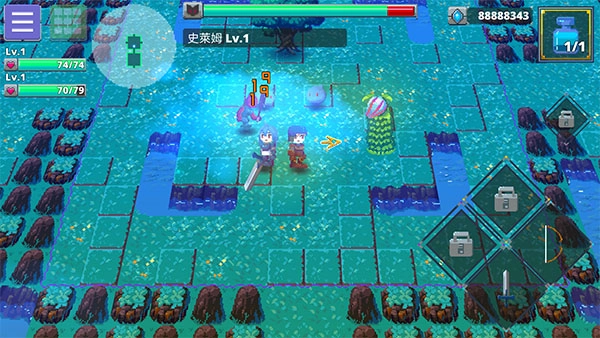 7、召唤伙伴后进入探索区域,遇到怪物时可使用右下角的剑或弓发起攻击。