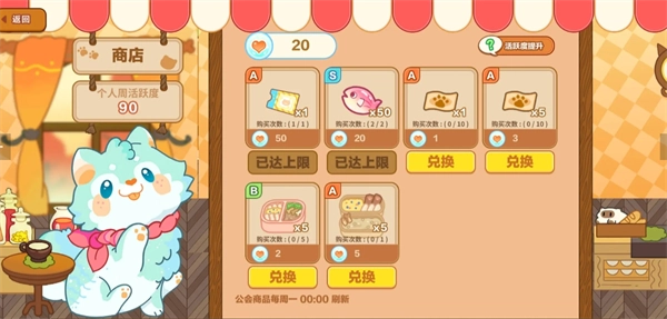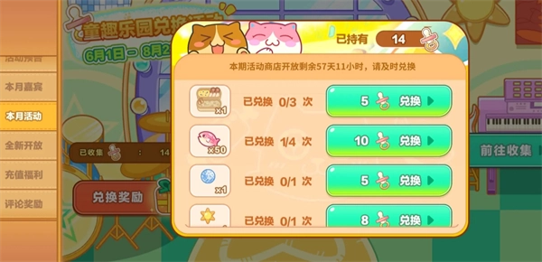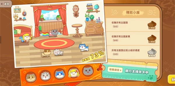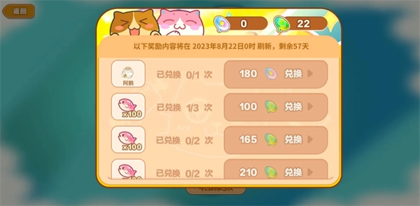5、图鉴、角色和家具!只要收集到猫猫和主题,就能兑换红鲷鱼,但兑换机会是一次性的。