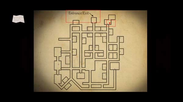 4、玩家可通过打开地图查看自身位置,地图上红色箭头所指之处即为当前所在位置,标有“EXIT”字样的则是出口。