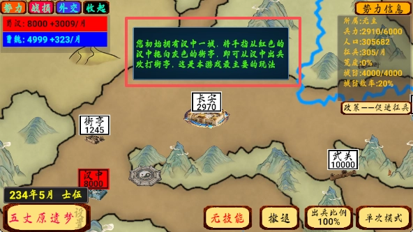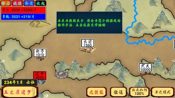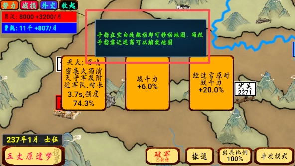 3、我们一开始只有汉中这一座城池,把手指从红色的汉中拖动到灰色的街亭,就能从汉中出兵去攻打街亭,这就是主要的玩法。