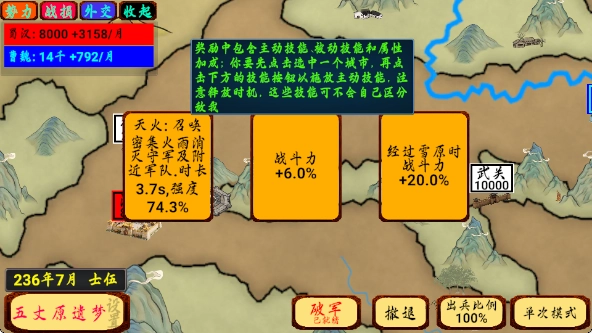 6、奖励包含主动技能、被动技能与属性加成:需先点击选中一个城市,再点击下方技能按钮来施放主动技能,要留意释放时机,这些技能无法自行辨别敌我。