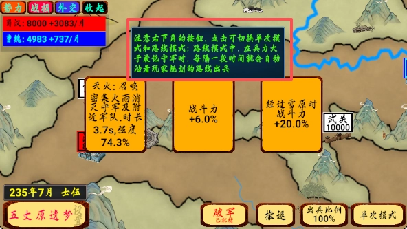 4、留意右下角的按钮,点击它能够切换单次模式与路线模式:处于路线模式时,当兵力超出最低守军数量,每隔一段时间系统就会自动按照玩家规划的路线派出兵力。