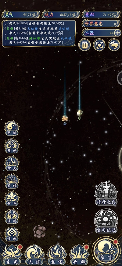 2、目前有孕育、开辟、天道、至宝、生灵等玩法;