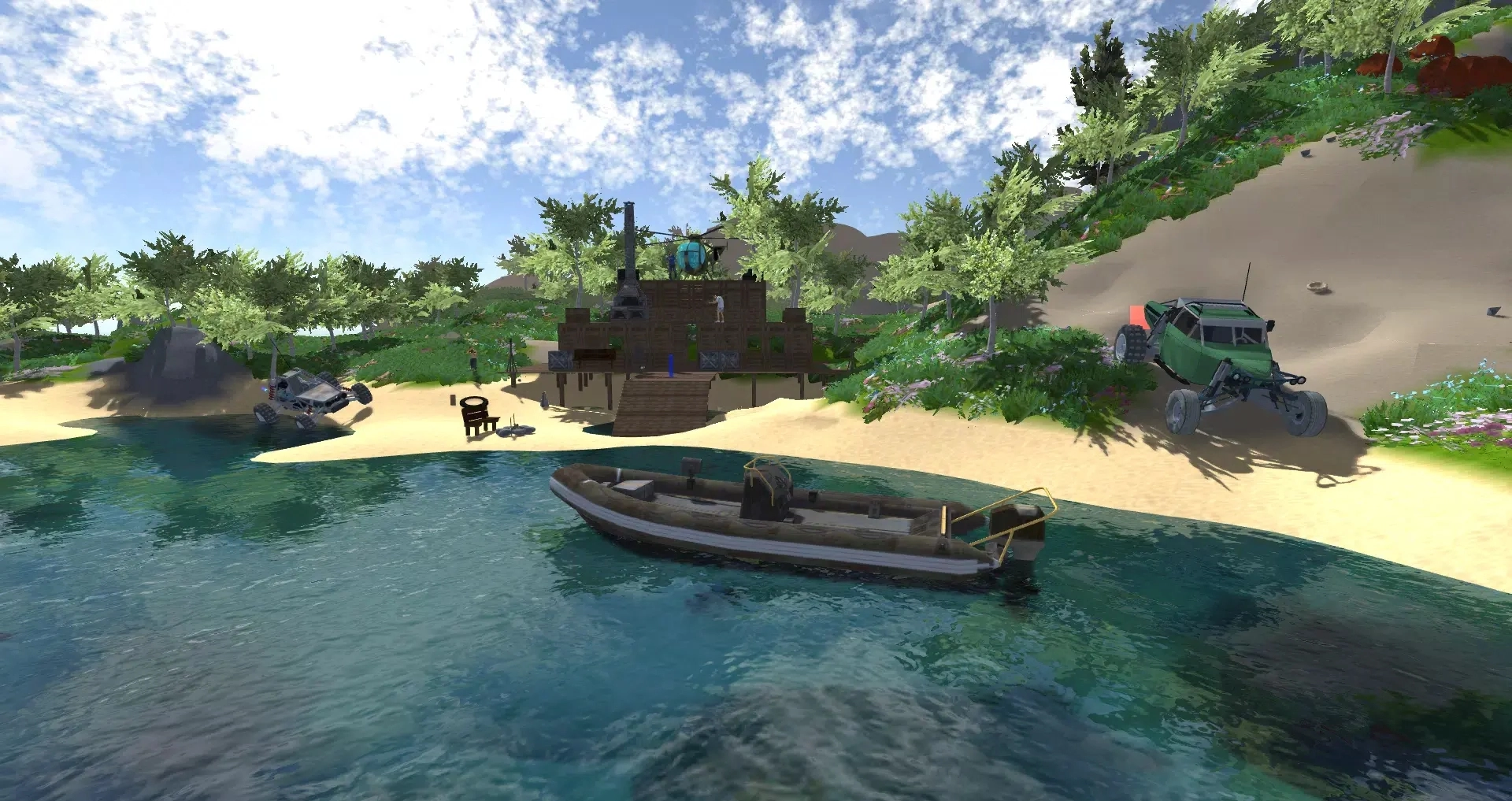 生存技能树涵盖50多项可解锁能力,从基础的采摘、烹饪,到高阶的陷阱制作、环境改造,每项技能都贴合真实生存逻辑。例如初期依靠香蕉充饥,中期掌握壁炉烤肉的技术,后期能搭建全自动农场达成食物自由。建筑系统则支持完全自由创作:破坏任意地形获取资源,建造多层楼阁、地下堡垒,甚至设计配备家具的豪华别墅。独特的“模块化建筑”机制让玩家可以将卡车、轮船、直升机等交通工具融入基地,打造移动堡垒。
