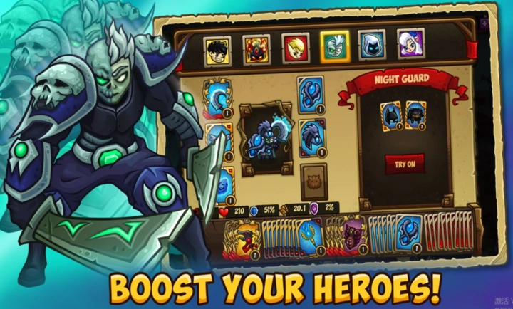 3、防御英雄需参与王国围攻、塔防战与锦标赛,完成突击任务,开采资源,收集并升级CCG卡牌,还得和国王麾下的帝国战士一同训练。