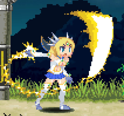 紧接着上面的特效,马上松开副武器的蓄力,随即周身带电并闪烁着光芒在空中旋转,这时候自机处于完全无敌状态,不管是杂兵还是BOSS都无法攻击到自己。从起跳直到落地有挺长一段时间,能打出相当漂亮的伤害,在空中还可以控制移动方向。