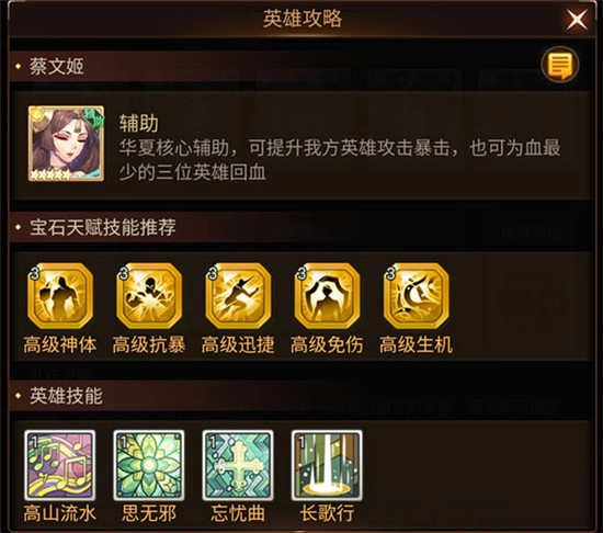华夏核心辅助,能提升我方英雄的攻击与暴击,还可为血量最低的三位英雄恢复生命值。宝石天赋技能建议搭配高级神体、高级抗暴、高级迅捷、高级免伤、高级生机。