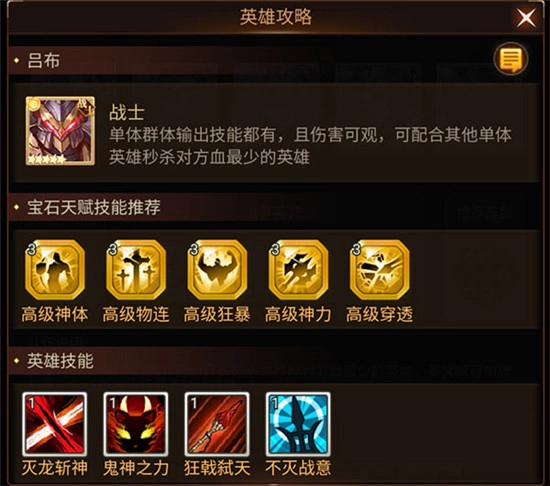 华夏阵营里擅长单体输出的英雄,其技能释放后能为自身带来增益效果,从而打出极高的伤害量。在宝石、天赋与技能的搭配上,建议选择高级神体、高级物连、高级狂暴、高级神力以及高级穿透。