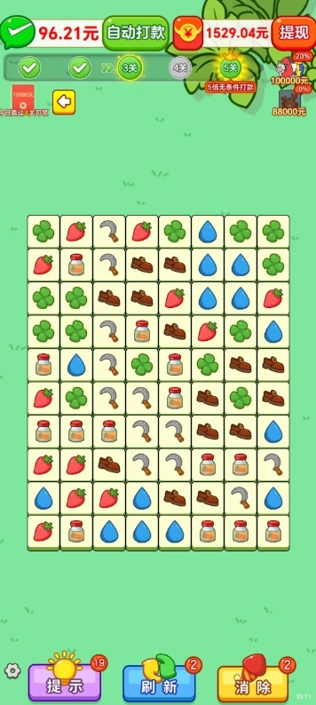 2、设有底部卡槽,一般容量不大,玩家点击方块将其放入卡槽,当卡槽内凑齐3个相同图案时即可消除。