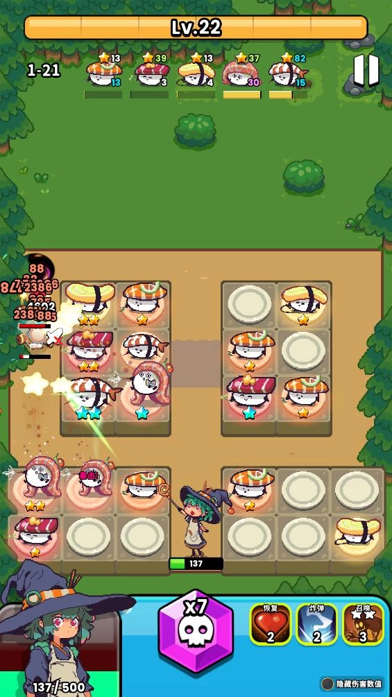 3、像紫菜寿司和黄瓜寿司这类属于范围攻击,鸡蛋寿司则是单体攻击,可用来消灭更多怪物。