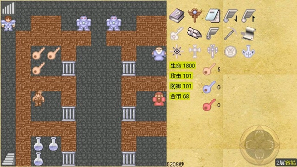 5F:楼:先向上攻击绿色史莱姆,再向右攻击绿色史莱姆,接着向下攻击红色史莱姆,打开门获取剑。然后向上攻击红色史莱姆,不经过那扇门,回到中间路线攻击蝙蝠拿到钥匙,最后下楼。