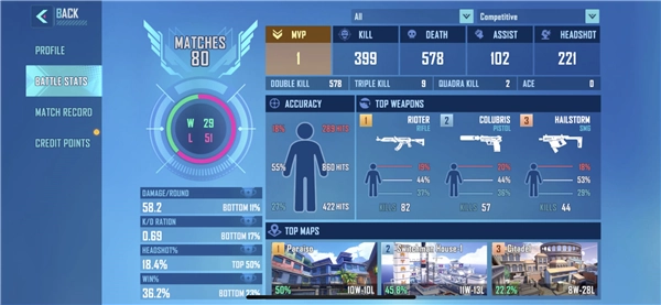 游戏内的玩家数据统计维度十分完善,从个人段位相关信息、MVP次数、信誉分情况,到KDA数据、不同地图的胜负历史统计等,都能直接查看。