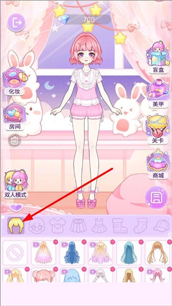 2、进入装扮房间后,玩家能够为人物进行化妆、美甲,还可以开启双人模式等操作。点击下方的工具栏,即可选择人物的发型。