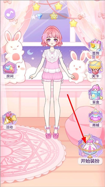 1、启动装扮魔法少女应用,进入主界面后,玩家可进行打开房间、签到、挑战关卡、逛商城等操作,随后点击开始装扮;