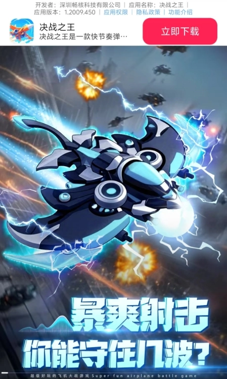 《决战之王飞机》是深圳畅核科技有限公司精心打造的超人气肉鸽射击游戏,以爽快的弹幕射击对战玩法带来持续激情,让人欲罢不能。游戏内有多款战机等待解锁,玩家可在肉鸽射击对战中不断挑战,是一款非常值得体验的作品,快叫上小伙伴们一起加入《决战之王飞机》的冒险吧!