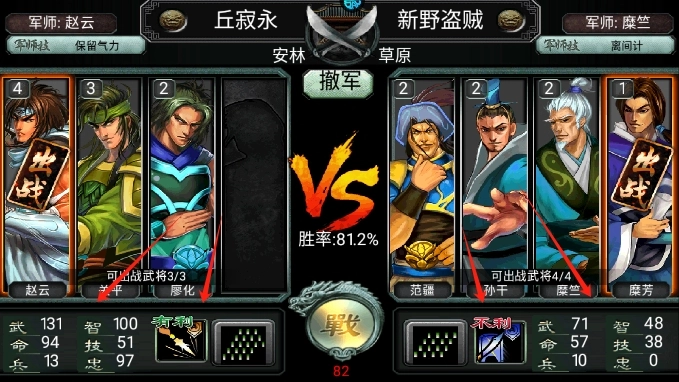 安排武将的出战顺序至关重要,出征前要确保生命值、技能值和士兵数量都补充至满额,选用不同兵种的武将时,优先让能克制敌军兵种的武将先出战,己方的高级武将则留到关键节点去对抗敌方的高级将领。
