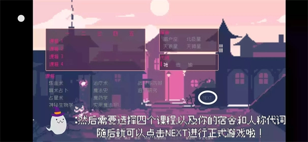 请注意,课程必须选满四门才能继续,宿舍和代词选项也别忘了选择,不同的课程组合会解锁不同的角色哦!