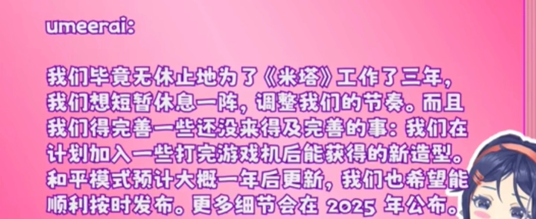 米塔开发者大爆料:他们近期将休息一段时间,待休息结束后,会继续对米塔进行完善,并为其设计一些新造型。