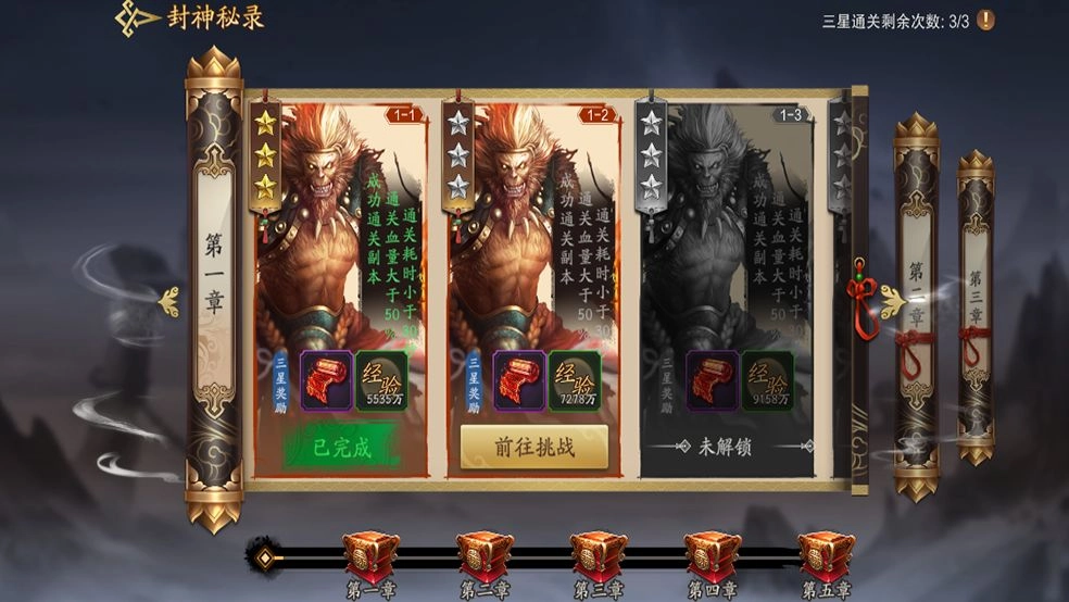 《封神秘录》的关卡评价体系包含失败、1星通关、2星通关、3星通关四个等级,修行者必须先达成上一关卡的3星通关条件,方可解锁并挑战后续新关卡。