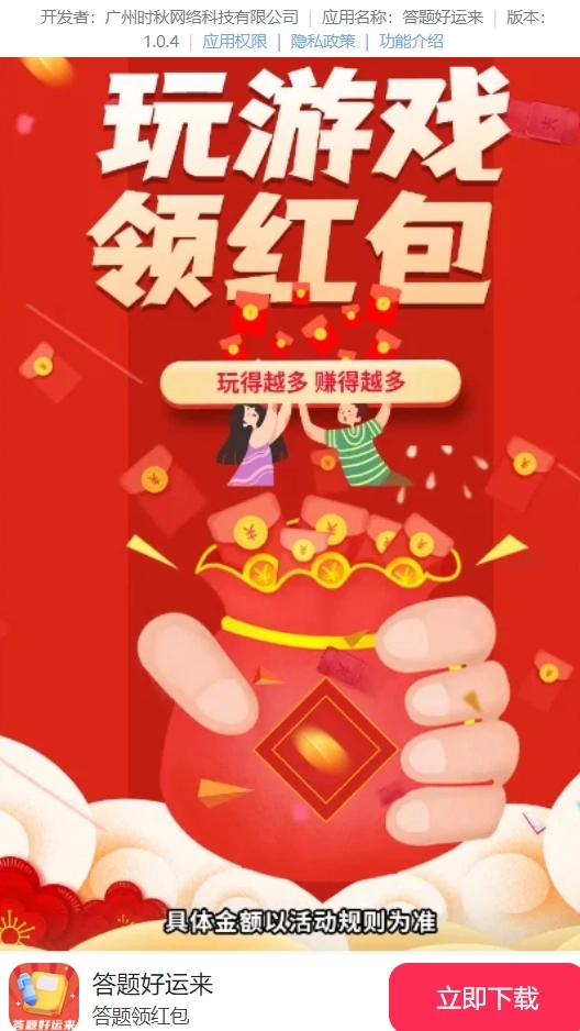 答题好运来赚钱版是广州时秋网络科技有限公司精心打造的精品之作,它采用了趣味答题的全新玩法模式,福利满满、好运不断,惊喜连连。每次答题通关都能获得随机红包,让你成就感十足,全新的答题赚钱之旅就从这里开启吧!