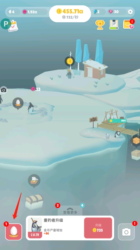 1、当积累到足够的金币后,就能得到一颗企鹅蛋,这时点击左下角的企鹅蛋。