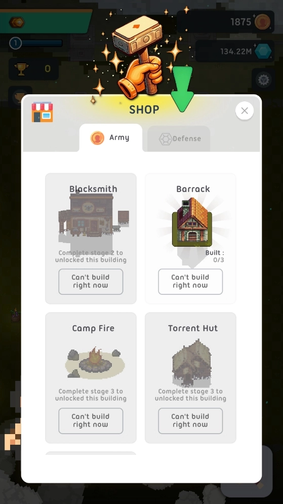 4、点击锤子图标,建造防御塔楼,然后点击“defens”进入相关界面。