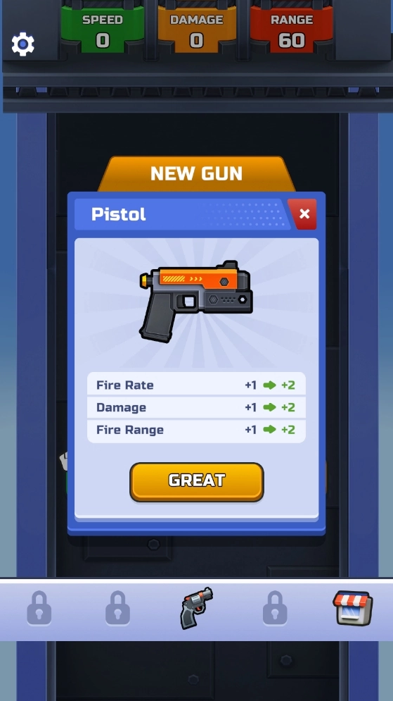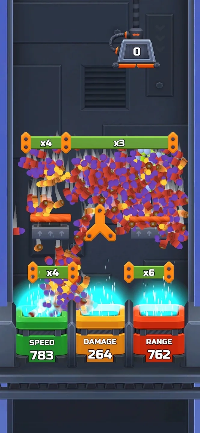 1、进入后,通过滑动屏幕来移动,把子弹投入你想要提升的属性中,这些属性分别是速度、伤害和射程。