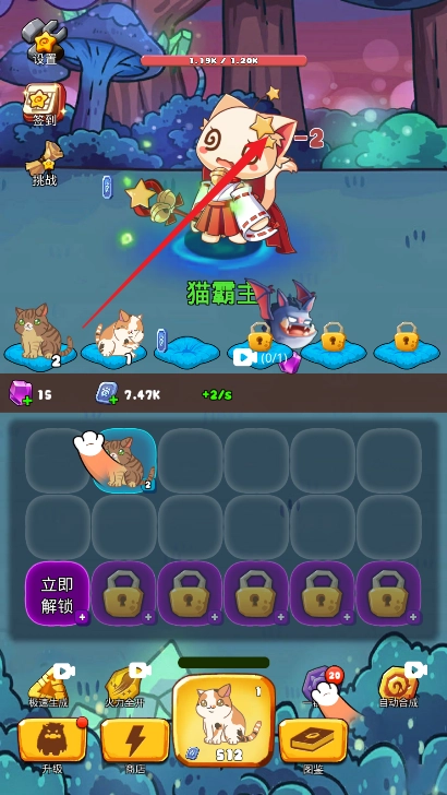 游戏采用放置挂机玩法,猫咪会自动参与战斗,你不用一直手动操作,只需按时收取掉落的奖励就可以了。