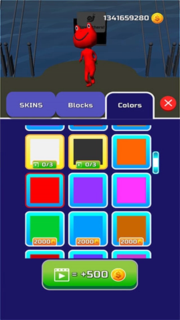 3、上方第一栏是角色模型,第二栏是砖块样式,第三栏则是角色皮肤颜色,大家按照自己的喜好解锁就行(解锁方法是点击直接解锁,最下方的按钮是看广告加金币的按钮,有些物品可以用金币点击购买,还有些物品需要观看多次广告或者付费购买)