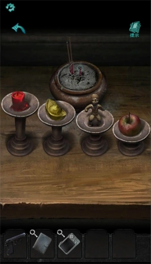 4.打开棺材房里那个上了锁的小柜子,从中获取《贡品》。接着,将贡品放置在山神像的面前。然后,依据照相机里的照片所给出的提示,完成相关操作。具体的摆放顺序依次是:蜡烛、元宝、小人、果。