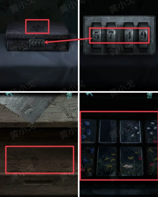 10.点击床上的盒子,依据盒子上的图案提示,再结合天窗外花的种类与数量线索,以及抽屉里的刻痕,输入密码:5749