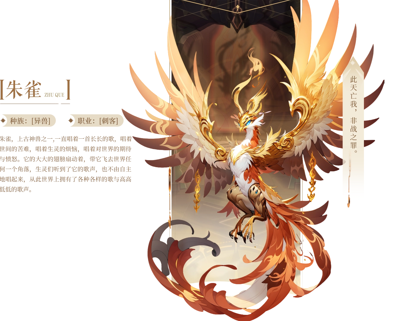朱雀,作为上古神兽之一,始终吟唱着一首悠长的歌谣。它唱尽世间的苦难,唱遍生灵的烦恼,也唱着对世界的期盼与愤懑。它那宽大的翅膀扇动着,载着它飞往世界的每一个角落。生灵们听到它的歌声,便也情不自禁地跟着唱起来,从此,世界上便有了形形色色的歌与抑扬顿挫的歌声。