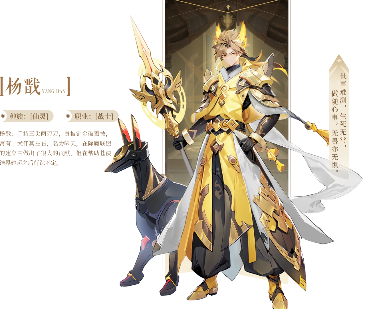杨戬,手握三尖两刃刀,身披销金破披风,身边常伴着一条名为啸天的神犬。他为除魔联盟的创立立下汗马功劳,然而在协助建成苍泱结界后,便没了固定行踪。