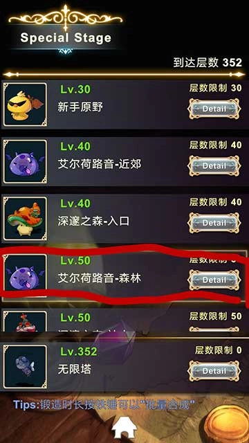 5、接着选择层数,这里建议新手刷50层,会掉落普通金属和木头。