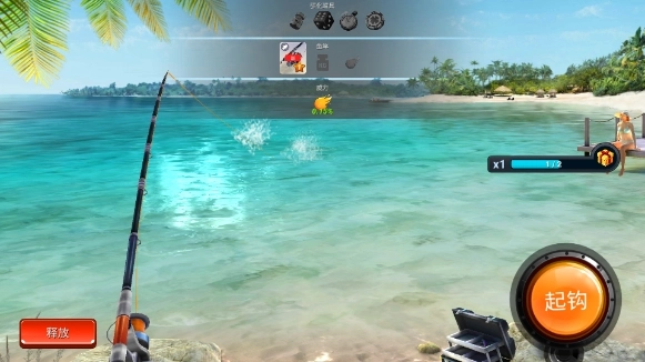 5、钓鱼过程中设有“释放”和“起钩”两个按钮,“释放”意味着放弃当前这次钓鱼操作,“起钩”则是把已经上钩的鱼儿钓上岸来。