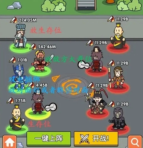 1、诸葛亮、凯撒、赛博之柱、始皇帝、红眼隐忍是目前版本的最强阵容,其中只有诸葛亮可以根据情况替换,始皇帝和红眼隐忍是绝对核心,务必重点培养,这套组合的优势在于技能触发条件低、出手速度快,搭配起来哪怕面对战力高出近一倍的关卡也能轻松推进。