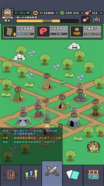 这是一款融合放置、肝系玩法与文明进化元素的游戏,主角携系统转生到【一级文明】——两河文明,成为原始部落的族长,需通过完成通关任务,推动文明向下一阶段进化。